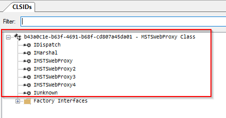 In this example, there is 11676 different CLSIDs are registered. Expanding the view on one of these CLSIDs, in this case the MSTSWebProxy Class, we can see the exposed Interface Identifiers - IID, and their names: