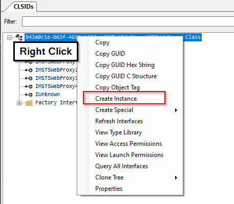 - In many cases, it is not possible to create an instance via the GUI; you need to invoke each CLSID/IID and their functions with custom code.