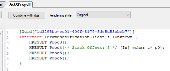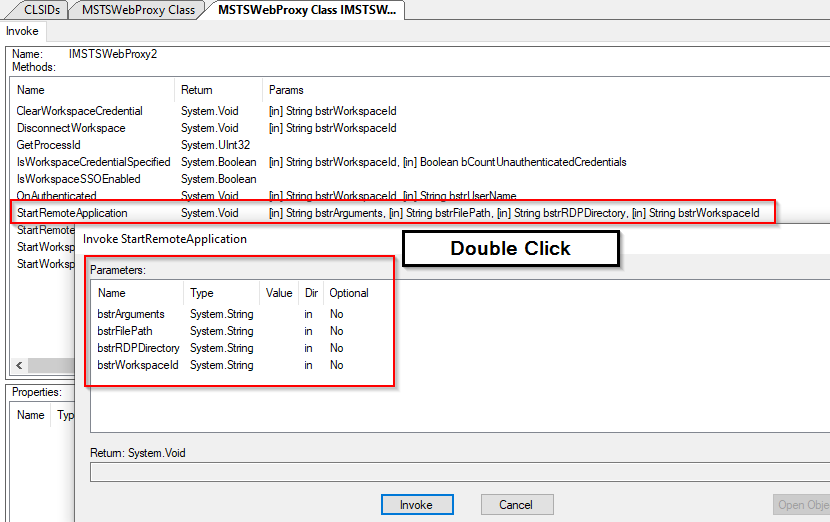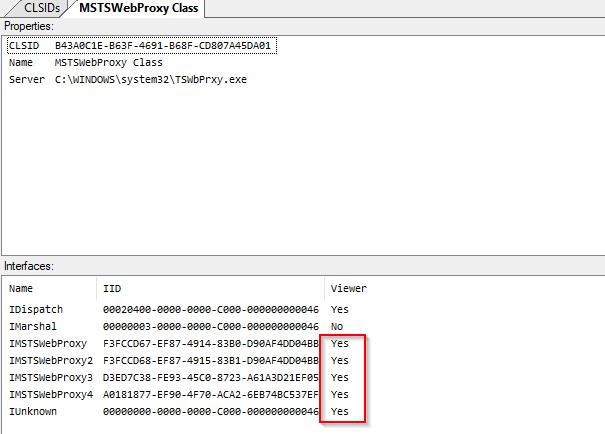 If this interface can be activated remotely and you have the necessary permissions, this could be considered a new DCOM code execution vector. An attacker could replace C:\Windows\System32\mstsc.exe with an arbitrary executable via C$ from a remote location and launch it using this function. However, I would not recommend doing this in a real-world project, as removing or replacing built-in Windows binaries can always lead to disruption! Usually, all CLSIDs either spawn an executable on the remote system where the code is hosted, or load a DLL into existing processes such as for example svchost.exe. Therefore, replacement of executables is possible with many of them. The MSTSWebProxy class was just chosen here to demonstrate the overall process for an analysis.