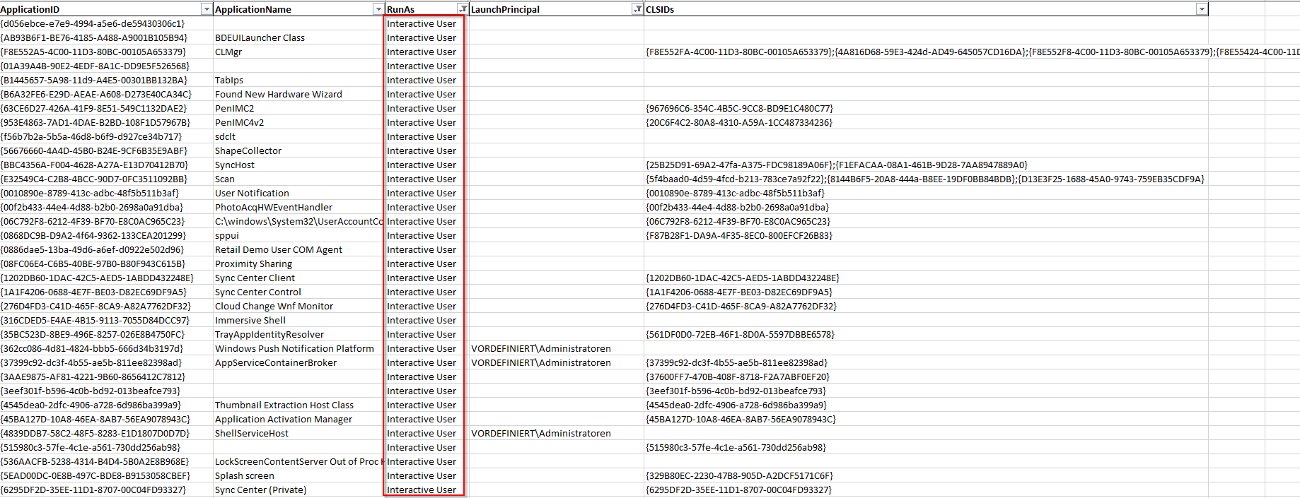 Inspired by the tool PermissionHunter, which has useful filter options, this was first used for the initial enumeration of potentially interesting target CLSIDs. We can easily filter the more than 11.000 CLSIDs to get a smaller list for this specific use case. We filter RunAs Interactive User, LaunchPrincipal Everyone or Administrator or Empty, RemoteActivation and Launch or empty, and obtain the following result:
