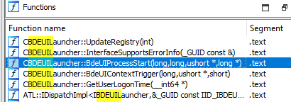After many hours, lots of interesting functions had been found, but no direct code execution primitive. One CLSID stood out as the perfect candidate at first glance: AB93B6F1-BE76-4185-A488-A9001B105B94, the BDEUILauncher class. The code-hosting executable is BdeUISrv.exe, and when we checked the available functions, one stood out: