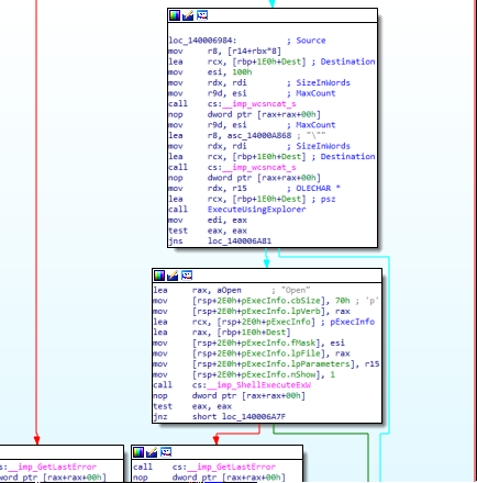 When he joined the analysis, it quickly became clear that the first input parameter — an integer — determines which executable is spawned by ShellExecuteW. Unfortunately for us, this was not user-controlled, but one of four hardcoded executables.