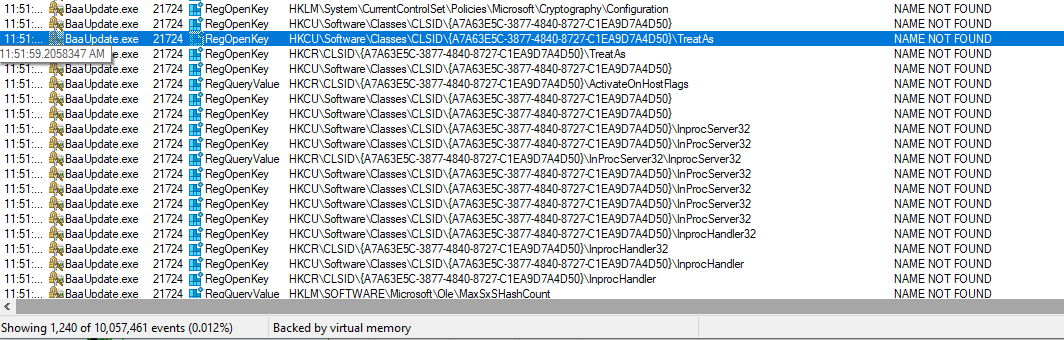 In this case if BaaUpdate.exe is spawned with two input parameters (and we can influence the input parameters via the ushort input parameter), it tries to load non existent CLSID entries from HKCU.
